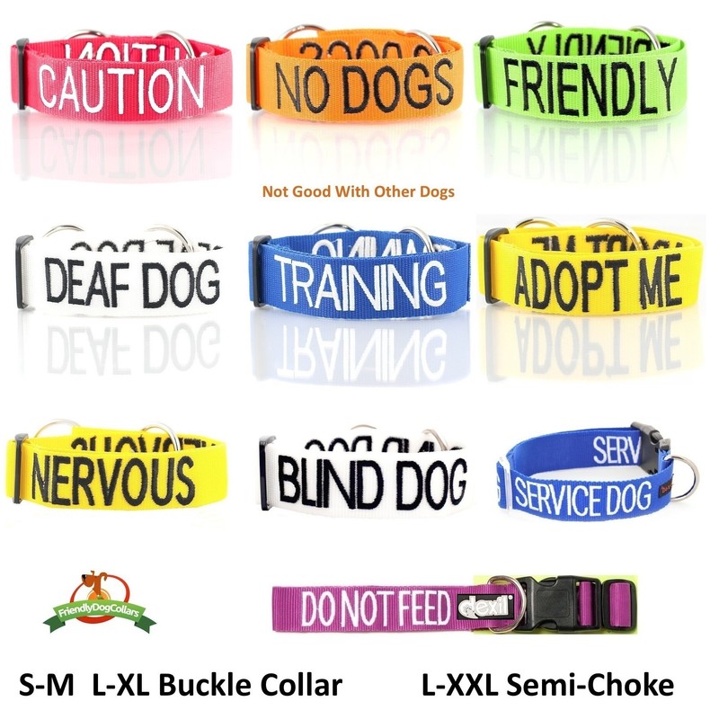 The system: Red 'CAUTION' (Do Not Approach) Orange 'NO DOGS' (Not good with other dogs), Green 'FRIENDLY': (Known as friendly to all), Yellow 'NERVOUS', Blue 'TRAINING', Blue 'SERVICE DOG', White 'BLIND DOG', White 'DEAF DOG', Purple 'DO NOT FEED', Yellow 'ADOPT ME'