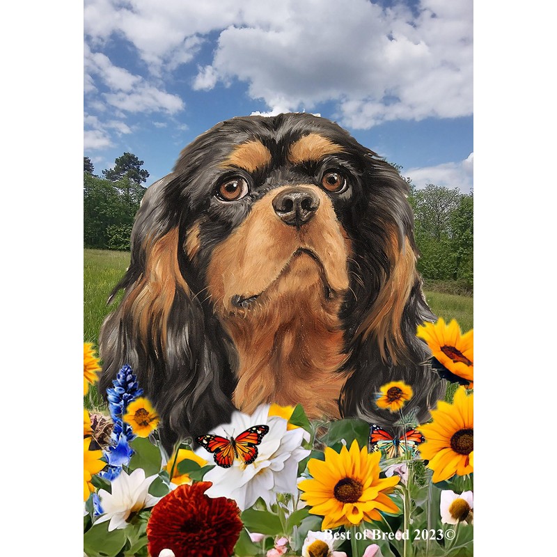Cavalier King Charles Black/Tan - Best of Breed Spring Flowers Garden Flag 12" x 17"