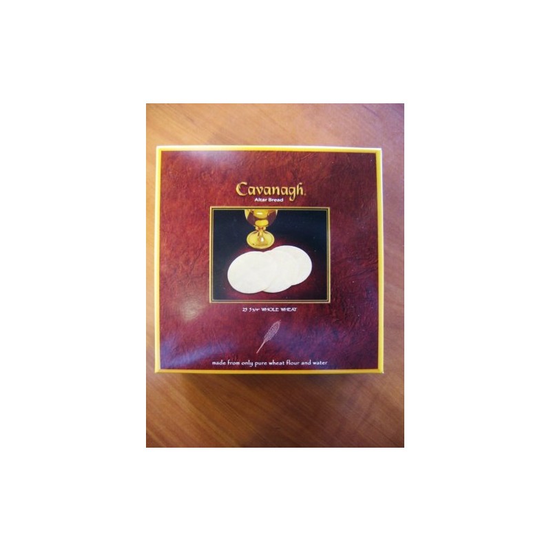 Communion Wafers - Box of 25 Wheat - 5-3/4" Diameter This is a large celebration wafer with impressed lines for easy breaking into 24 pieces. Highest quality wafers, have a carefully molded sealed edge which prevents crumbs. Baked of only pure wheat flour and water and are made strictly without additives. Produced in the U.S. in an exceptionally clean and modern automated facility. Sealed minutes after baking with superior packaging. Cavanagh is a manufacturer for most denominational houses.