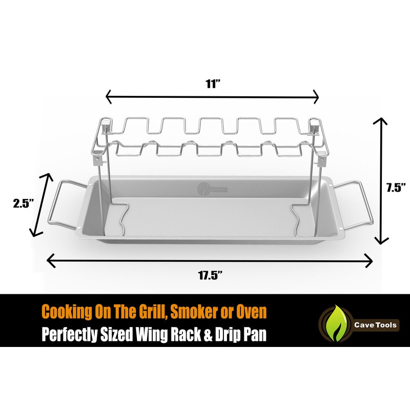 Cave Tools Chicken Wing & Leg Rack for Barbecue Grill Smoker or Oven - Stainless Steel Vertical Roaster Stand & Drip Pan/Grill Grease Tray for Cooking Vegetables in BBQ Juices - Dishwasher Safe