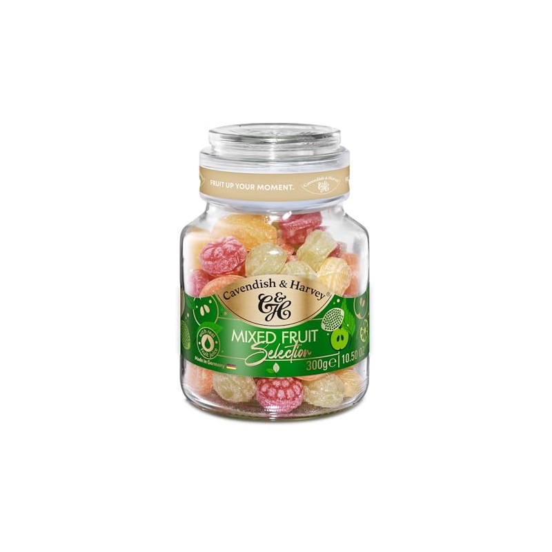 - Mixed Fruit Drops: This deluxe jar contains a delicious medley of fruit sweets made with real fruit juice: juicy lemon and orange, crispy apple and raspberry.