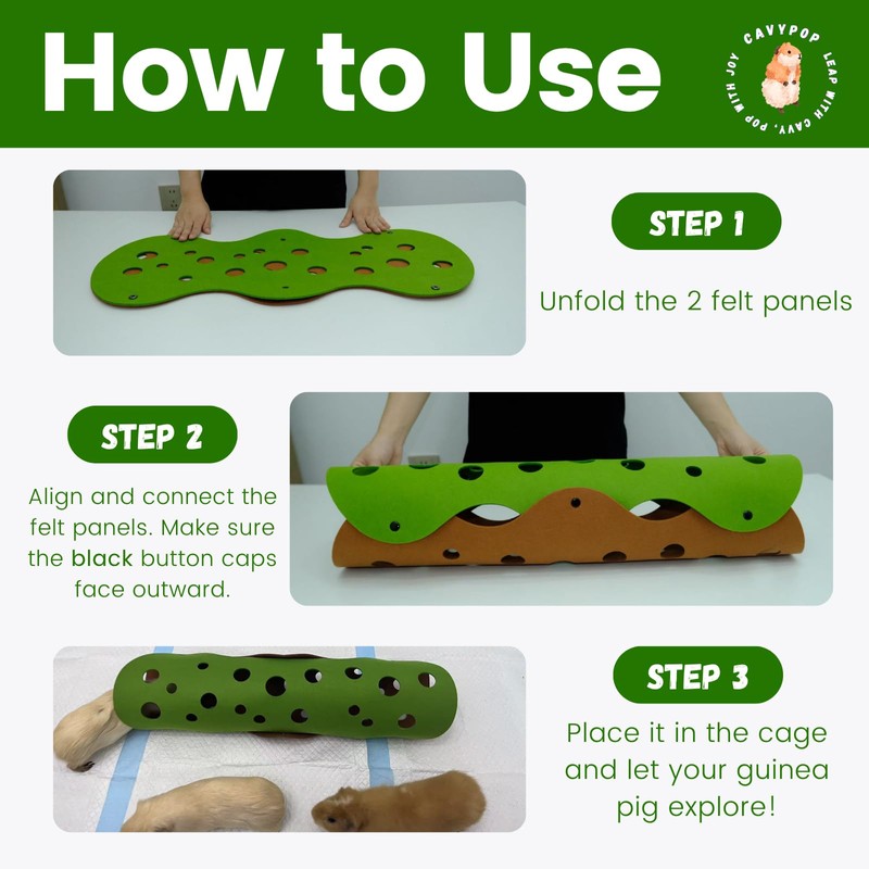Note: This product is designed with lightweight snaps for your pet’s comfort and safety. If you find any snaps loose or parts defective upon receipt, please feel free to contact us — we’ll respond promptly to make things right. Give your guinea pigs double the fun with the CAVYPOP 2-Pack Felt Tunnel Hideout Set — the perfect blend of play, rest, and practicality for small pets. Crafted from thick, durable felt with fun cheese-shaped holes, these hideouts provide both security and breathability. The felt is soft yet sturdy, giving your pets a cozy, safe space to explore, hide, or nap. Each tunnel measures 26×11×8 inches, making it perfectly sized for guinea pigs, chinchillas, dwarf rabbits, and other small animals. Cleaning is simple: each tunnel separates into two panels, which can be machine-washed and folded flat for easy storage. The lightweight design makes setup and transport hassle-free. Plus, the open-ended design allows for endless DIY play configurations — create U-shapes, zigzags, or connect tunnels together for a larger play zone. Whether you're decorating your pet’s cage, enhancing their daily enrichment, or looking for a summer favorite, this 2-pack set delivers excellent value and functionality.