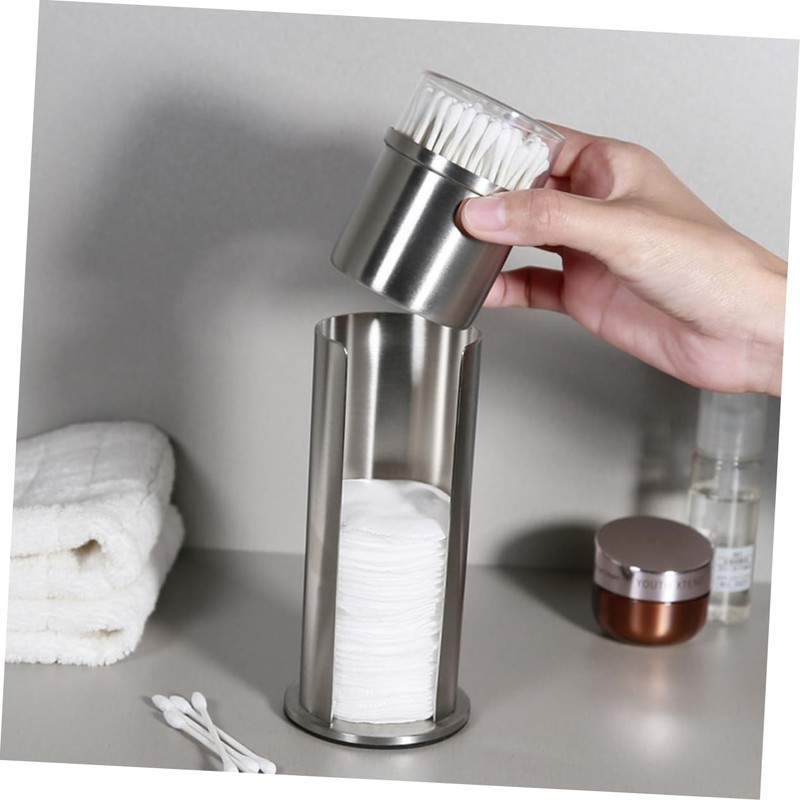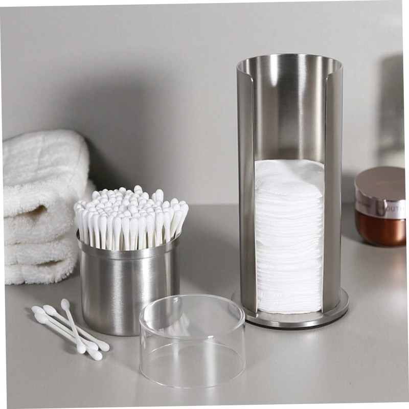 round cotton pads You can easily see what's in the container and find out what you need.round cotton swab box metal cotton swab holder cotton swab container cotton swab organizer cotton swab dispenser clear holder cotton holder This is a stainless steel storage box with cover design for cotton swab stick and cotton pads.metal organizer shelf Put your lipsticks, eyeliner, cotton swabs, or other small items in it, and keep your table clean and tidy