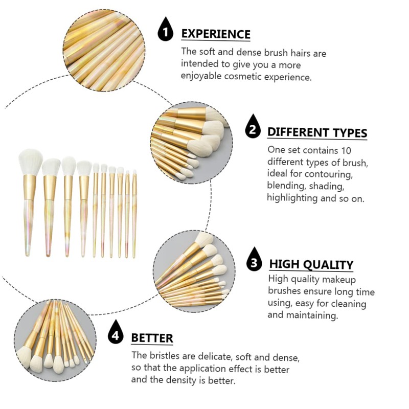 - Blending Makeup Brush: One set contains 10 different types of brush, for contouring, blending, shading, highlighting and so on.