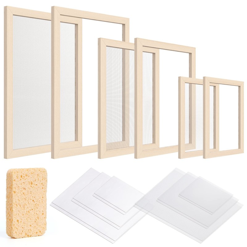 - What to get: The package contains 6 paper frames of 3 sizes (each size frame has a fixed mesh screen), 6 mesh of 3 sizes, 6 absorbent paper of 3 sizes, 2 for each size, and 1 sponge to meet your need for different sizes of paper