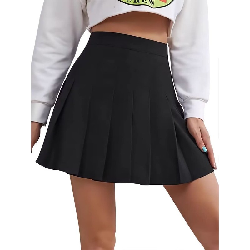 - This women's fashion high waisted black pleated skirts with shorts match with T-shirt,sweater,coat,jacket,baseball uniform,hooide,vest,leggings.