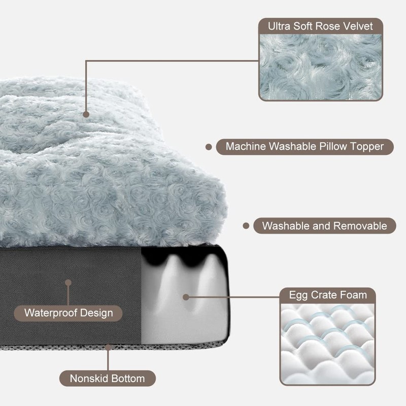 CBBPET Dog Beds, Washable Pet Mattress Comfortable and Warming Rectangle Bed for Medium and Large Dogs Optimal Comfort Every Time: Treat your pet to the luxury of a 4-inch high-density egg crate foam that supports their muscles and joints. This bed is especially suitable for elderly or pets with specific needs, helping to alleviate joint pain. Advanced Pillow Top Feature: Every pet, regardless of age, deserves unparalleled relaxation. With its attached fiberfill pillow over a mattress base, this bed offers an added layer of cushioning for unmatched lounging bliss. Soft and Inviting Sleeping Surface: Pamper your furry friend with a plush, rose-patterned surface. This soft fabric ensures an inviting and calming environment, facilitating a deep and restful sleep for your pet. Easy Maintenance and Care: Because we understand pets can be playful and messy, this bed offers hassle-free cleaning. The top portion is machine-washable, and its bottom cover is detachable, equipped with a zipper for convenience.