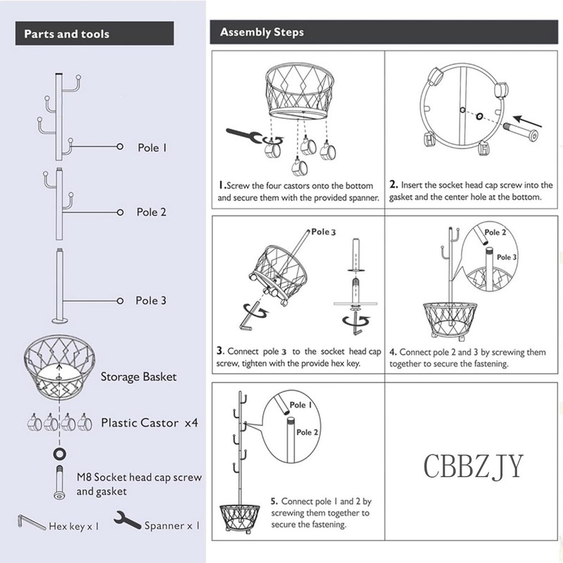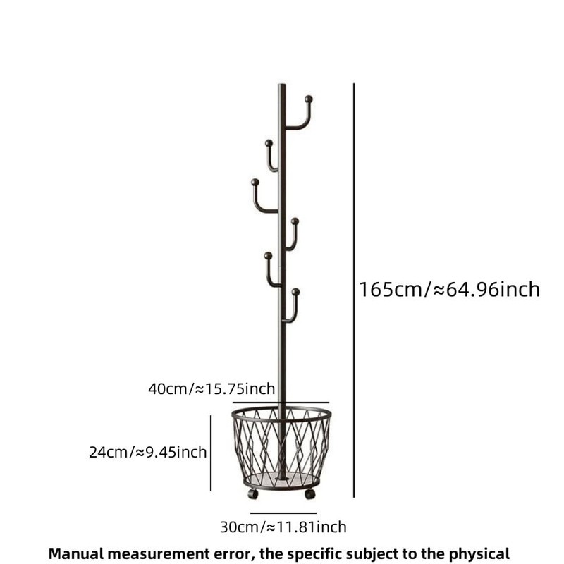 - VERSATILE DESIGN: This freestanding coat rack features a sturdy metal construction with 6 double-pronged hooks, a large basket, and 360° rotation for convenient access.