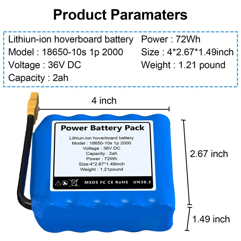 - 【BATTERY CAPACITY】72Wh, with high capacity hoverboard battery can make the device work longer without frequent charging. Please make sure the size, shape and voltage are the same. However, please note that due to long distance transportation, the new battery may not have enough power to start the hoverboard, so please need to fully charge the battery after receiving it, and start the hoverboard in a fully charged state