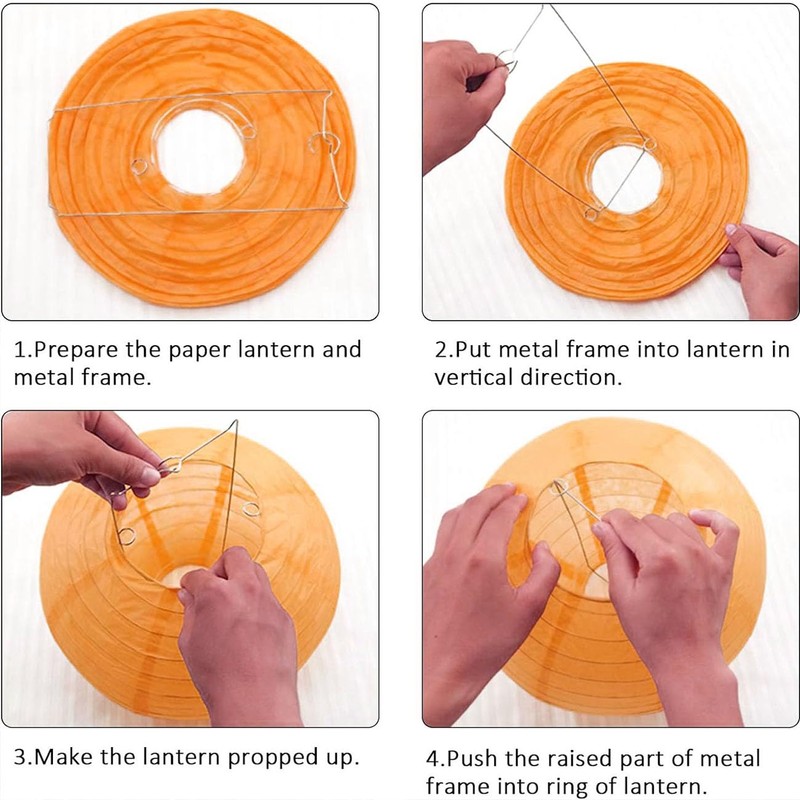 - Decorative lanterns are made of paper and a metal frame. Each lantern includes a sturdy metal stand that can be hung anywhere