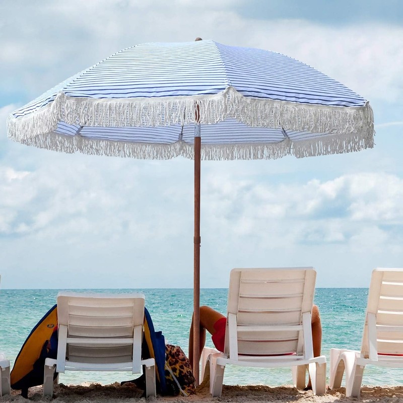 - Boho BEACH UMBRELLA: Elegant tassel design adds a fresh and unique appearance to meet your demand for anti-ultraviolet rays on the beach, Lounging under it feels like you're on vacation. Boho style and white fringes give your beach setup a beautiful fancy look, ideal for the patio, backyard, lawn, beach, picnic, pool and garden.