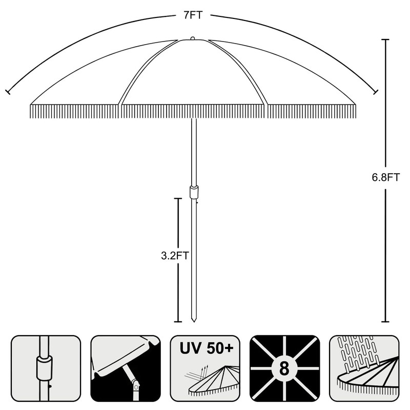 - EASY ASSEMBLY: Easy to install, measures 7 feet in diameter(open). Optional umbrella base and sand anchor are not included and must be purchased separately. The fringe patio umbrella is a perfectly choice for any place to get bohemian style. Welcome to contact us if you have any questions or concerns; We will guarantee a no-hassle refund or replacement (NO RETURN REQUIRED if it is a defective item), and resolve it for you in 24 hours!