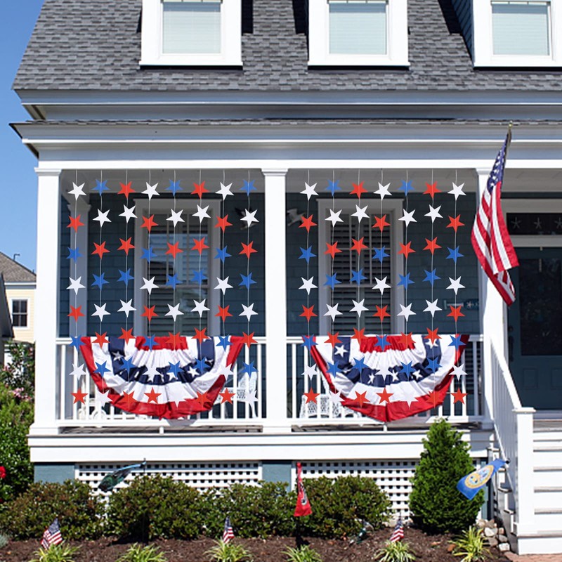 - Package:You will get 8 pack Patriotic star streamers garland banners,each heart garland consists of 18 pcs hearts(6red+6White+6Blue),144pcs star totally. Perfect for 4th of July BBQ, Memorial Day, Veterans Day Party, Independence Day Celebration, Labor Day, Holiday Decorations. Create atmosphere to your home.