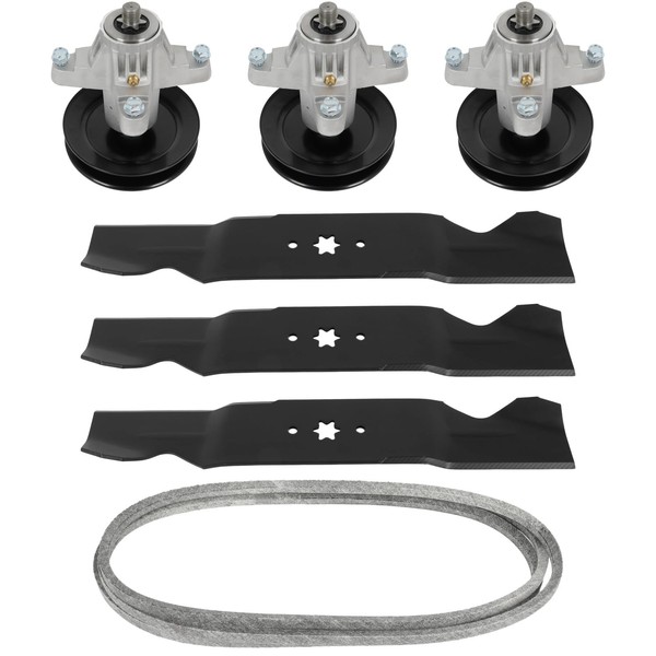 - [Package Includes] The mower blade rebuild kit includes 1 drive belt, 3 spindle assembly, 3 mower blades
