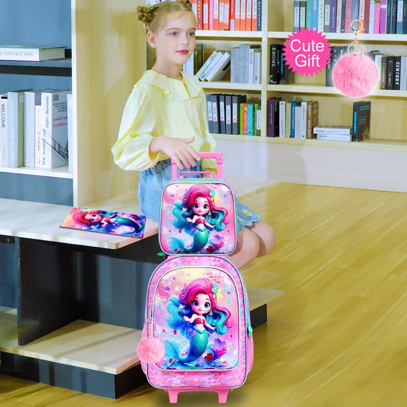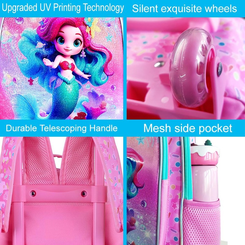 - 【Roller Backpacks for School Design】This girls' wheeled backpack has an upgraded UV cute mermaid print on the front pocket. The cute and Playful elegant mermaid will sparkle in different light, which will fill children with infinite fantasies, stimulate their imagination and desire to explore, and add a touch of fun to their day. This backpack on wheels has a reflective strip on the front pocket to protect children's travel safety.