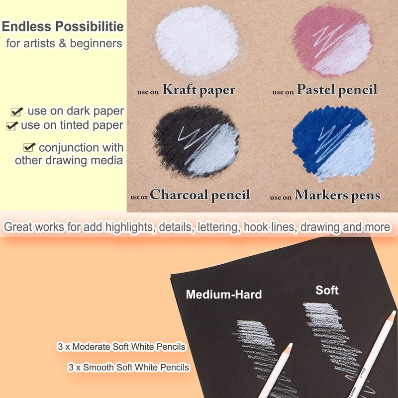 - Set of 6 Charcoal White Pencils Set - coming with 6 pcs professional charcoal white colored pencils ( included 3 smooth soft white pencils + 3 Moderate softness white pencils). Our white chalk pencils is ideal for use on dark or tinted paper, can also be used in conjunction with other drawing media, pastel, graphite pencil, markers, acrylics etc, great works for add highlights, details, lettering, hook lines, drawing and more