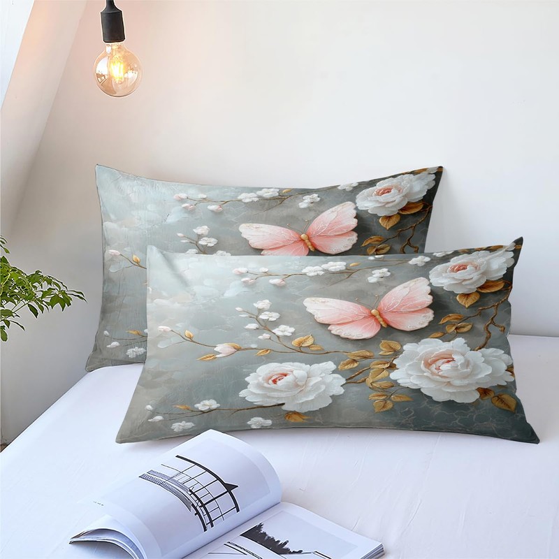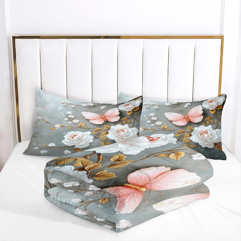 This grey pink butterfly comforter set is crafted the unique tight stitching process, which prevents fill from clumping or shifting. And it adopts the new 3d printing technology, the pattern is clear and does not fade.