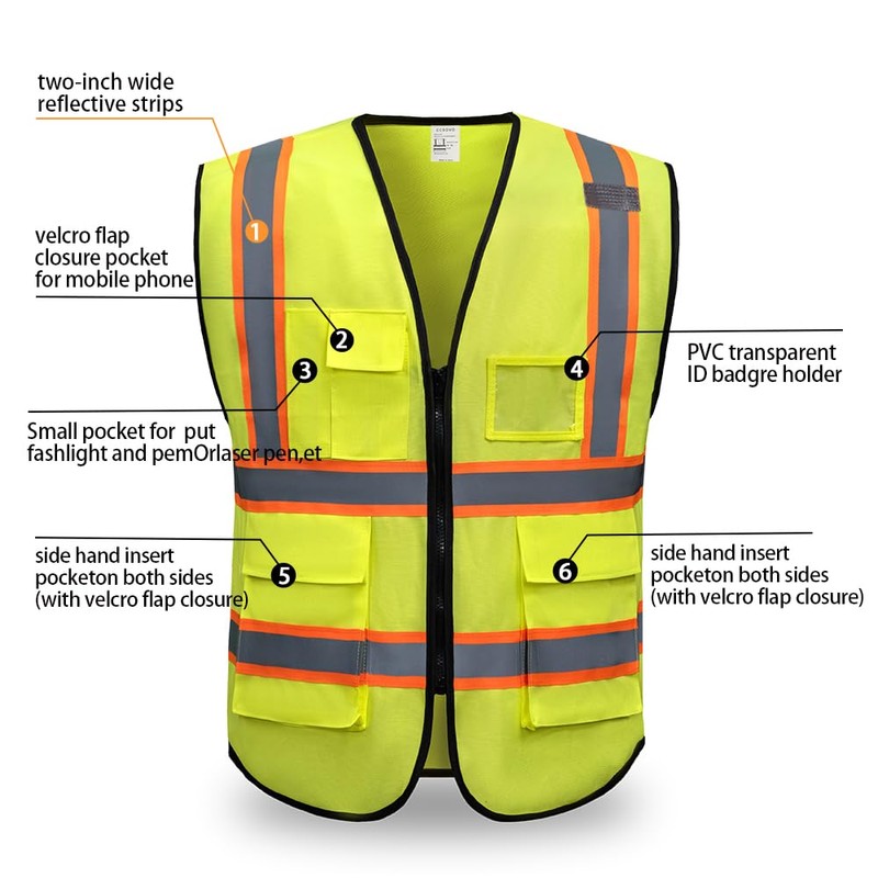 - Versatility and applicability: This vest is equipped with multiple pockets and hanging rings, the chest pocket of the top can hang pens and ID cards, and the lower pocket can hang personal items such as mobile phones; Suitable for various scenarios, such as traffic command, road construction, cycling, running, night fishing and so on. Whether you are a professional or an ordinary consumer, this reflective safety vest will meet your safety needs.