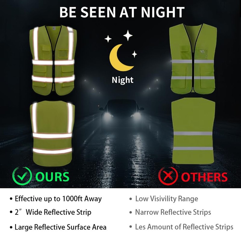 - Saving: this reflective vest is suitable for every man and woman when it comes to night walking, by bike, on the road or on foot, in the park or jogging, with motorcycles, volunteers, city workers, construction workers or caterers