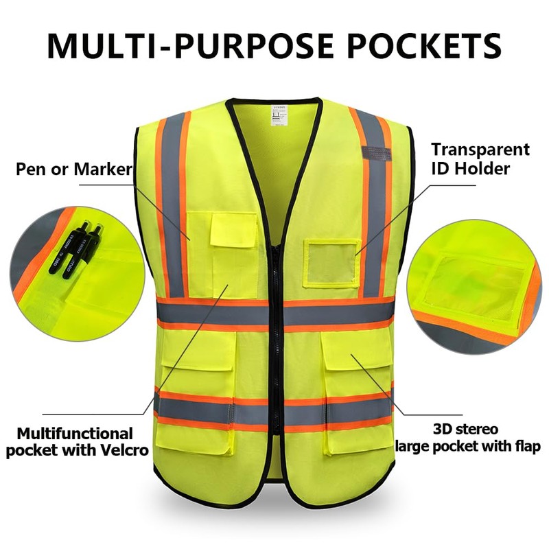 CCSOVO High Visibility Safety Vest with Zip Pockets, Reflective Work Vest, Breathable for Construction Site, Bicycle & Night Work, High Visibility in the Dark, Yellow cloth, 3 XL