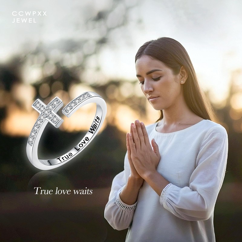 CCWPXX 925 Sterling Silver Cross Ring – Adjustable Christian Ring for Women Engraved True Love Waits, Minimalist Religious Faith Jewelry, Size 7-9