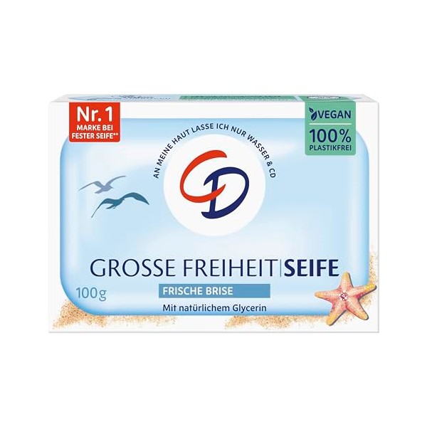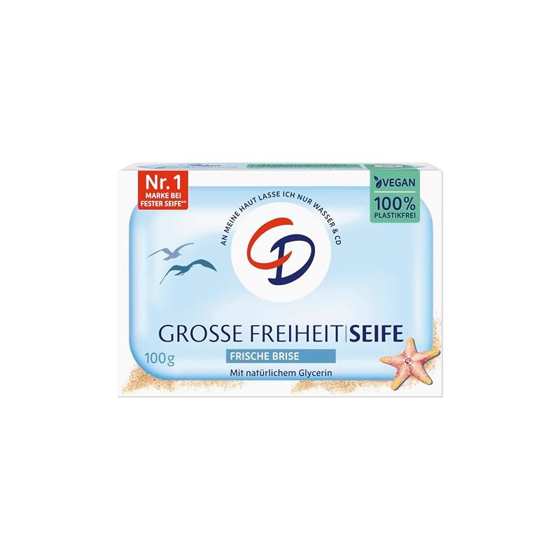 CD Große Freiheit Seife mit natürlichem Glycerin und dem Duft einer frischen Brise. Milde Reinigung und sanfte Pflege auch bei empfindlicher Haut. Seit seiner Gründung 1961 konzentriert sich CD Körperpflege auf Werte wie Natürlichkeit, Transparenz und das Wesentliche: milde Pflege aus der Natur mit bewusst ausgewählten Inhaltsstoffen. Dezente und feine Düfte zeichnen uns aus, ebenso wie das 2011 selbst auferlegte Reinheitsgebot. Das bedeutet Verzicht auf Mineralöle, Silikone, Parabene, synthetische Farbstoffe und tierische Inhaltsstoffe bei allen CD Produkten mit dem CD Reinheitsgebot. Seit 2015 sind alle CD Deos mit der bekannten Veganblume der Vegan Society ausgezeichnet. Alle CD Produkte, die das CD Reinheitsgebot tragen, sind somit auch vegan. Darüber hinaus engagiert sich CD seit Jahren gegen Tierversuche und setzt sich für die Erforschung und Förderung alternativer Testmethoden ein.