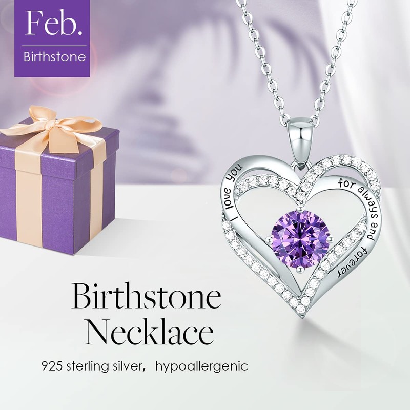 CDE Forever Love Heart Pendant Necklaces for Women 925 Sterling Silver with Birthstone Zirconia, Anniversary Birthday Christmas Gifts for Wife, Jewelry Gift for Women Mom Girlfriend Girls Her White Gold February