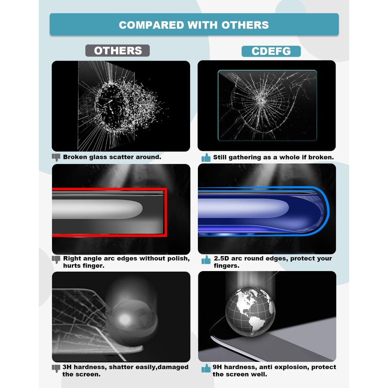 - CDEFG Support: CDEFG brand is dedicated to providing customers with products and service. Our screen protectors are certified by trusted standards such as SGS, RoHS, and CE
