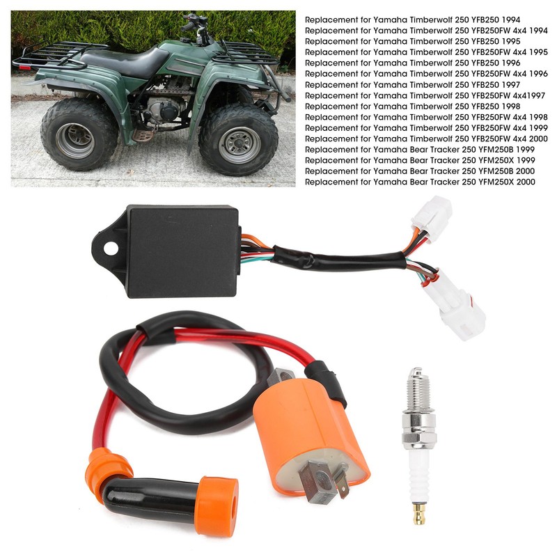 1、Replacement for Yamaha Timberwolf 250 YFB250 1994. Replacement for Yamaha Timberwolf 250 YFB250FW 4x4 1994. 2、Provides higher intensity sparks, faster recovery and response, increased ignition energy intensity, and easy start. 3、Improve combustion efficiency and enhance electrical performance. Made of high‑quality plastic and metal material, stable performance, high reliability. 4、Direct replacement installation, no complicated tools required, convenient for using, you can reuse. 5、Perfect match for the original motorcycles. Can directly replace the broken or shabby one.