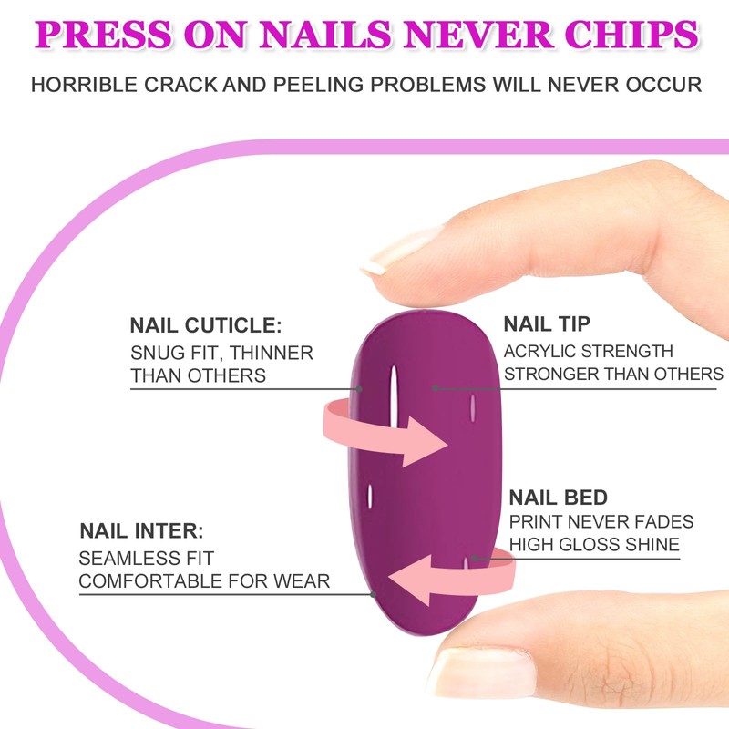 - 【Easy to Use】These fake nails are designed for easy application and removal. If you like, you can change your nails daily to match your outfit or mood. To apply, first, smooth the surface of your natural nails with the nail file, clean them, and then apply the jelly stickers to the back of the correctly sized false nail. Press the fake nail onto your natural nails for 20 seconds, and they will adhere securely. To remove, simply soak your nails in warm water for a few minutes, then gently lift the edges with the wooden stick. This method does not leave any residue or damage to the nails, and the removed glue on nails can be reused.