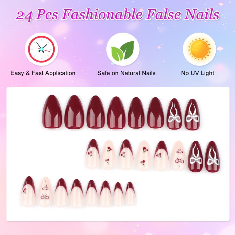 Ceboic 24Pcs French Tip False Nails Almond, Medium Glossy Fake Nails Cherry Red Press on Nails with Bow Design, Removable Full Cover Acrylic Stick on Nails for Women Girls Nail Art Accessories
