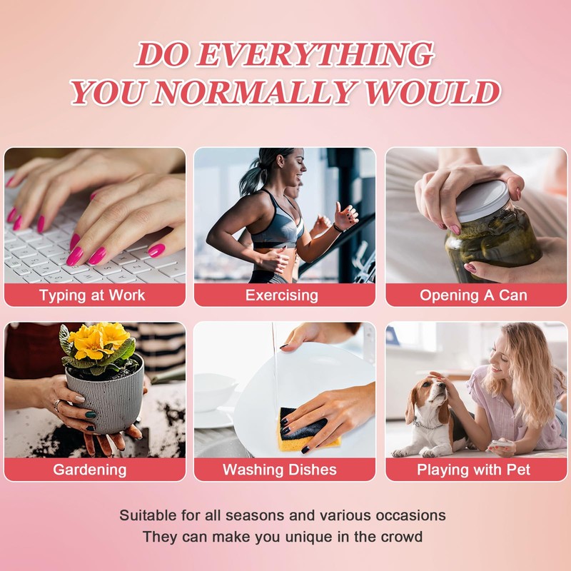 - 🌈【Amazing Convenience】No more costly and time-consuming salon trips, you can get your favorite manicure in just 5 minutes anytime and anywhere. Firstly trim and clean your natural nails, choose the nail piece that suits you, polish the nail bed, paste the jelly glue we give away, and press trendy nails for 15s to get the natural manicure that girls like.