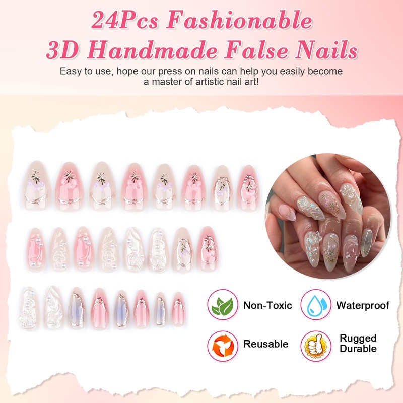 Ceboic 3D Handmade French Press on Nails, Almond Nails for Sticking with Charms, Natural False Nails with Butterfly, Flower, Bow, Pearls, Glossy Artificial Nails for Women, Pack of 24