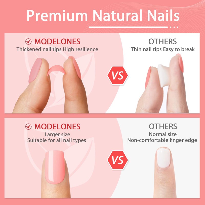 - Natural effect: acrylic press on nails are made of ABS material, are durable and elastic, do not exert pressure on your nail beds and feel like real nails. Adapts perfectly to the nail bed, with a gentle bend and a seamless cuticle line, and can be adjusted to better fit your nail shape.