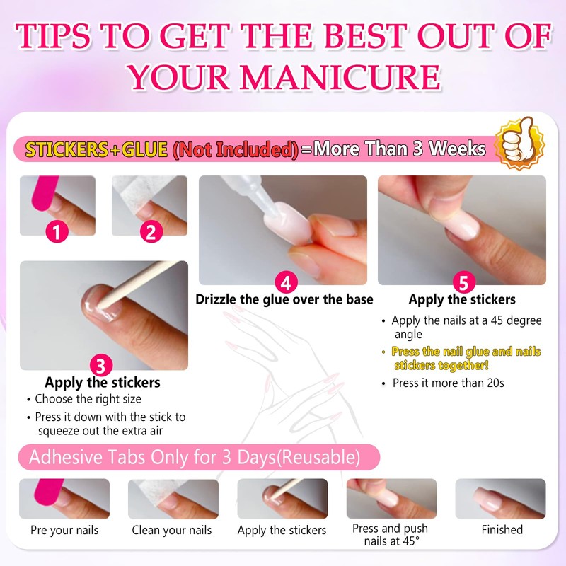 - Easy to apply and remove: Easily shorten and clean your artificial nails with a nail file. Then choose the right size for false nails, apply jelly glue and press it for 20 seconds to achieve a natural, beautiful manicure. Removing nails is just as easy! Soak your hands in warm water, gently lift the edges with a wooden stick and remove the nails without damaging them. Remove jelly residue and store the reusable false nails for next time.