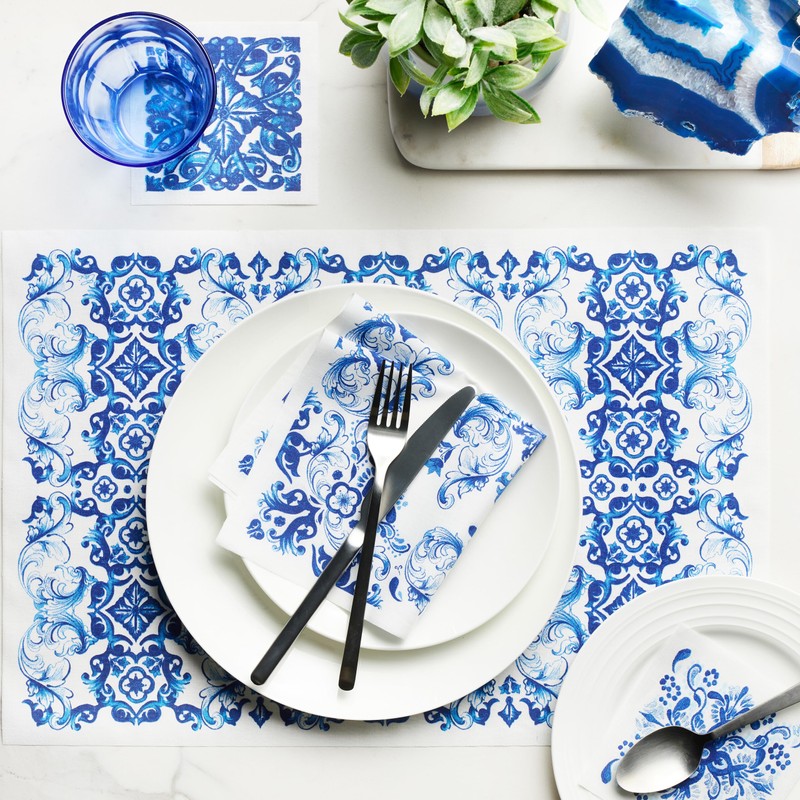 - 50 Units per Roll: Each roll of Cocktail Napkins comes with 50, 11 x 11 cm / 4.5_ x 4.5_ napkins. The cotton cocktail napkins tear away easily from the pre-perforated roll when needed. With 7 different designs per roll, the Mediterranean Tile cotton cocktail napkins add a unique and captivating aesthetic to any setting.