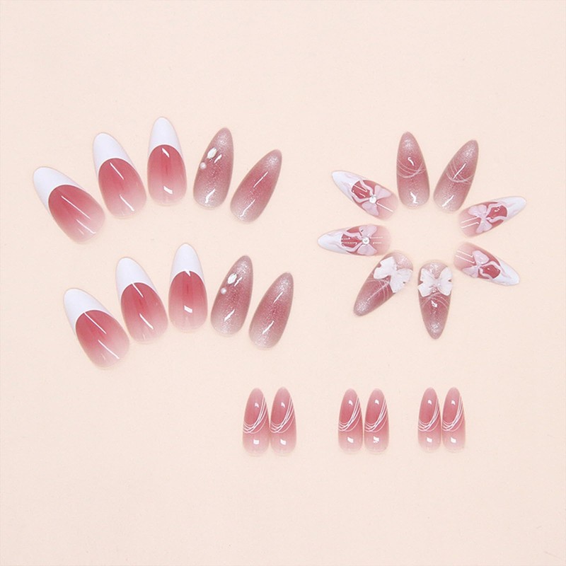 CECOBAG French Style Nail Patches Pink Almond Shaped Nails With 3D Bow Decoration Full Coverage Glue Nails Acrylic Artificial Nails Reusable 24 Pcs