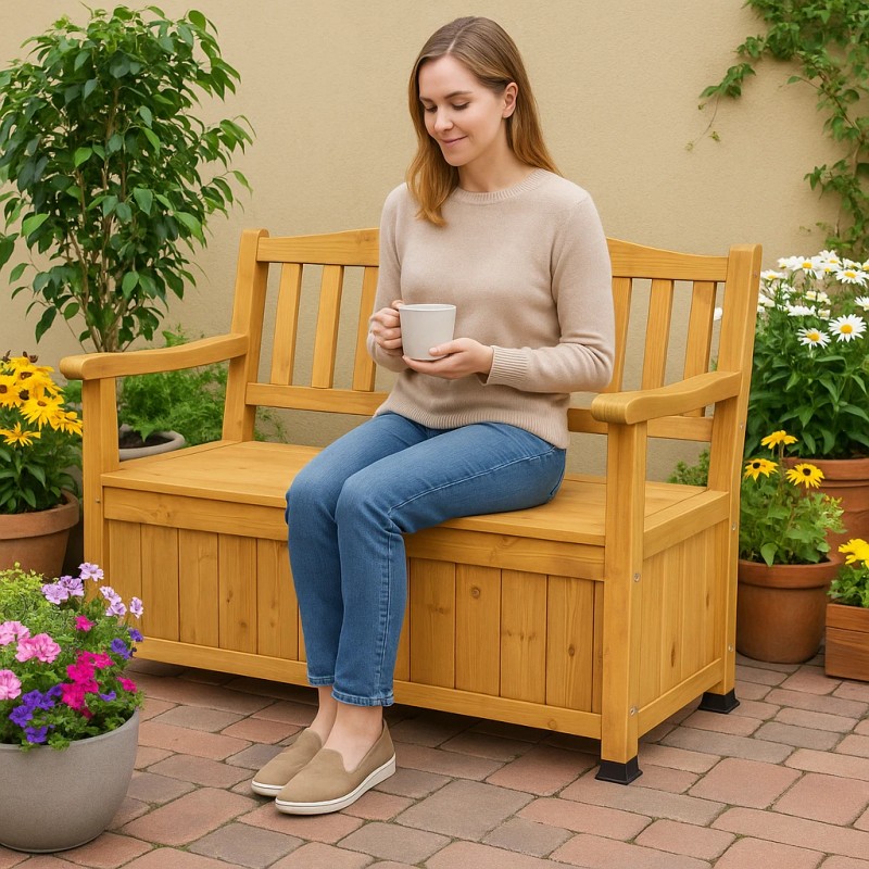 Built to last, this wooden bench features a sturdy seat plate that holds up to 440.92 lbs, making it ideal for everyday use in the yard, on the porch, or in a sunroom. The integrated backrest and armrests add comfort and charm, while the two-door design allows easy access to your stored items.
