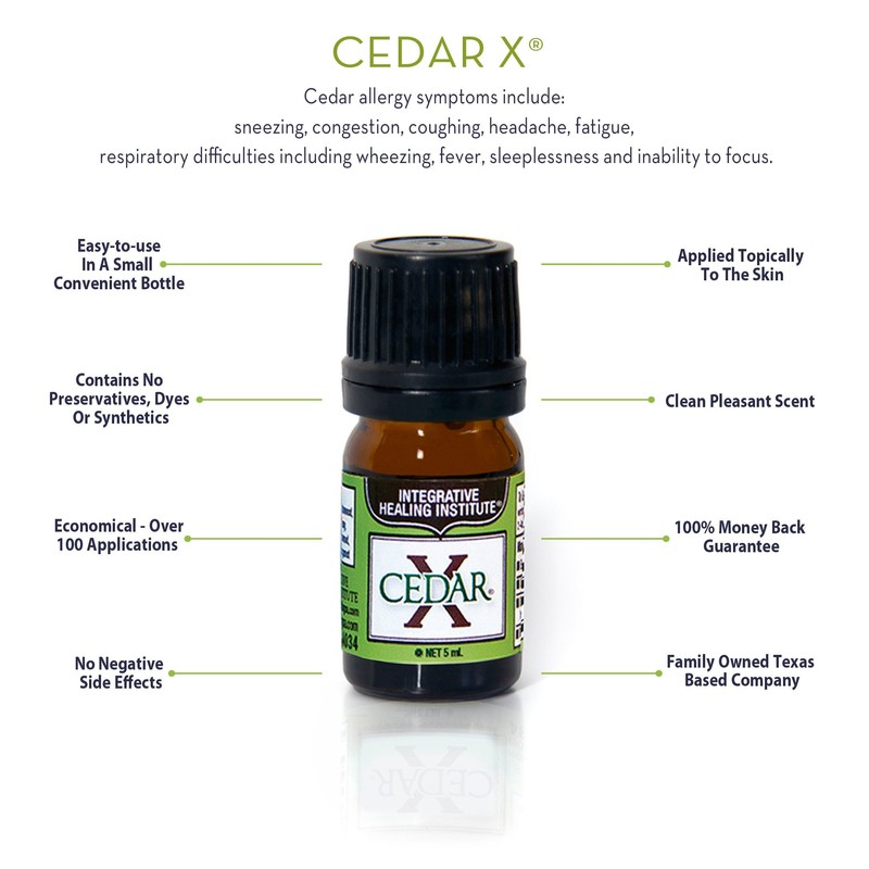 Cedar X is an all natural blend of essential oils that is applied to the skin to help lessen cedar allergy symptoms.