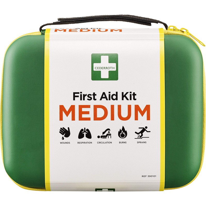 - The Cederroth First Aid Kit Medium contains 1 Cederroth 4-in-1 blood stiller, 1 Cederroth 4-in-1 mini blood stiller, 1 Cederroth Burn Gel Dressing, 10 Salvequick plasters, 4 Salvequick maxi covers, 1 elastic bandage 8 cm x 4 m, 6 Salvequick wound Cleaner, 1 brush. Breathing mask, 2 pairs of gloves, 2 safety hand cleanser, 1 rescue blanket with heat-reflecting aluminium side, 1 pair of scissors, 1 first aid instructions. Dimensions: W 23 x H 19 x D 8 cm.