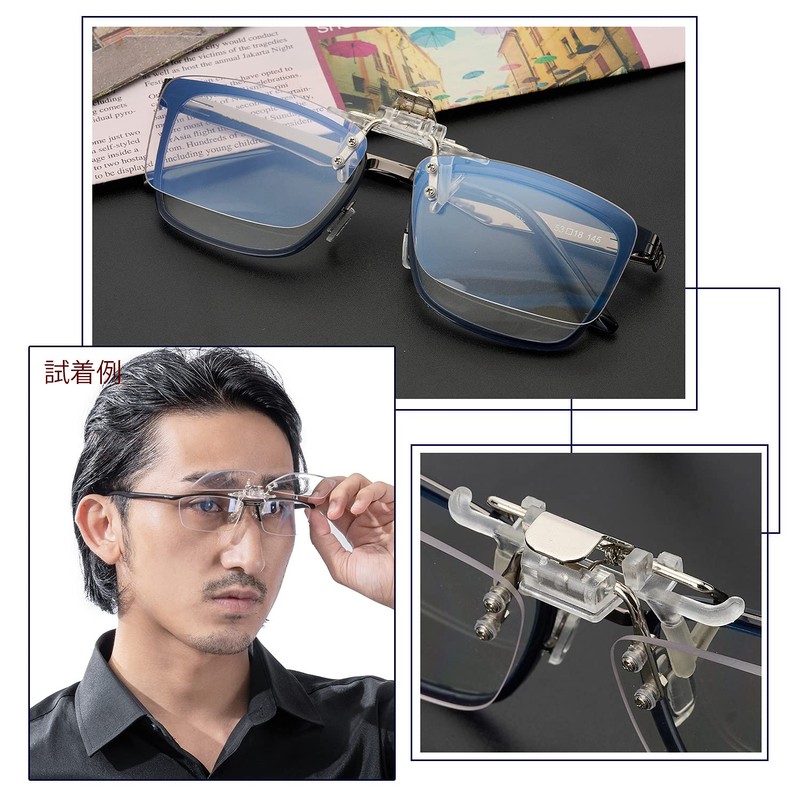 - 跳ね上げ機能:メガネのかけ外しをせずにレンズ部分を跳ね上げることで、二つの状態を手軽に切り替えられるクリップ式老眼鏡です。