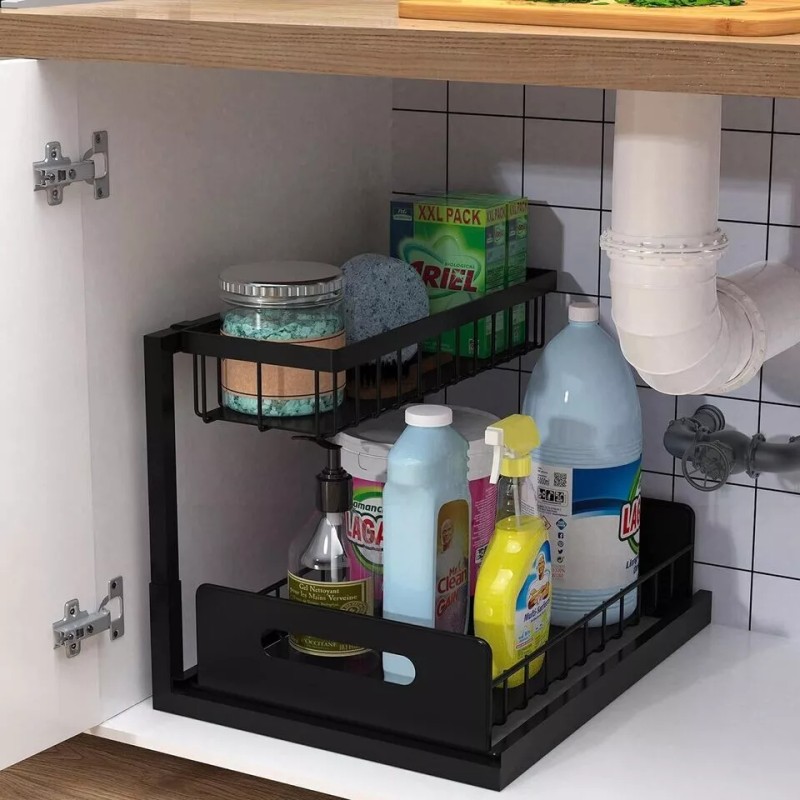 Do you find that your supplies are always getting lost at the back of your cabinets? Or maybe you hate having to bend down and dig around looking for things? Our pull out under sink organizer can help you find everything you need at a glance