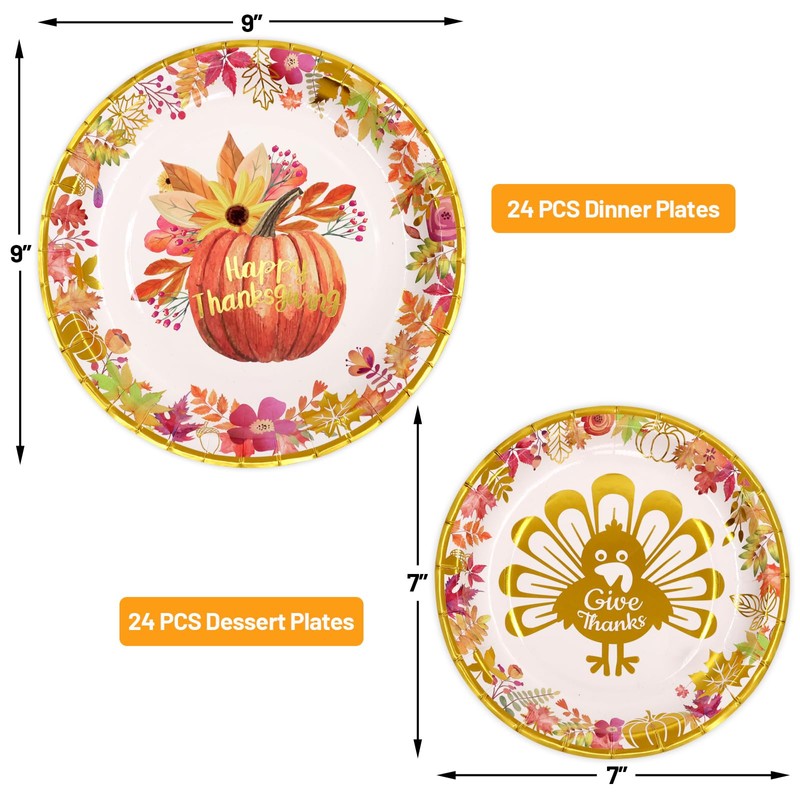 - What you get: Fall Thanksgiving Disposable Paper Party Plates for 24 Guests, including 24 Pcs Dinner Plates, measure 9 inch, 24 Pcs dessert Plates, measure 7 inch, Pumpkins Turkey Gold Foil Design