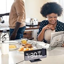 > Dual Alarms Clock with 2 Sounds Selection, You can set the traditional didi didi alarm and set the radio as the alarm bell.