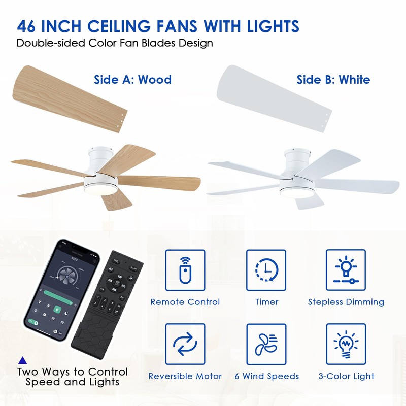 Ceiling Fans with Lights,46-Modern Low Profile Ceiling Fan with Remote Control,5 Dual-Sided Blades,Reversible DC Motor,White Flush Mount Ceiling Fan for Bedroom Indoor/Outdoor Use