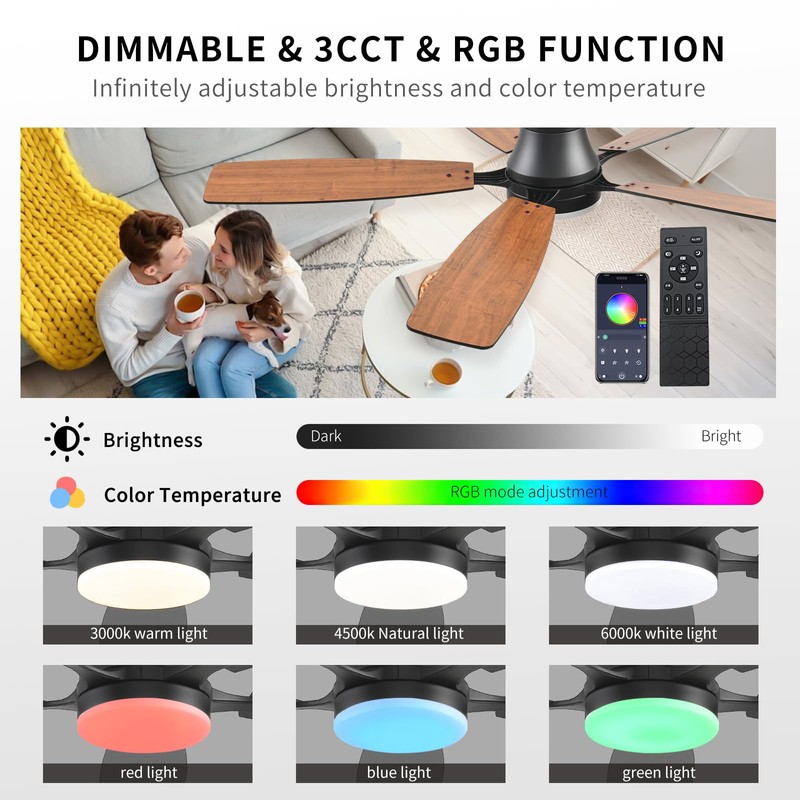 • 【 Dimmable Led & RGB Ceiling Fan】:The ceiling fans with lights features tri-color LED lights and RGB ambient lighting,Lighting can be controlled via the remote control and the App to switch from warm white (3000K) to natural light (4500K) and then to cool white (6000K),the ceiling fan can be adjusted between 10% and 100%. Double - press the "pair" button to switch between various RGB lighting modes. Enjoy the classic red - green - blue lighting modes and the eye - catching running - light mode, creating a vibrant and dynamic ambiance.