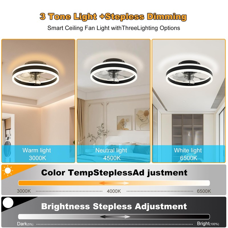 - Smart & Dimmable Light - This flush mount ceiling fan light has 3 color lighting modes that can be controlled by a remote / APP, ranging from warm (3000K) to white light (6500K). It is also dimmable, with a range of 10% to 100% brightness, allowing you to adjust the light from dark to bright.