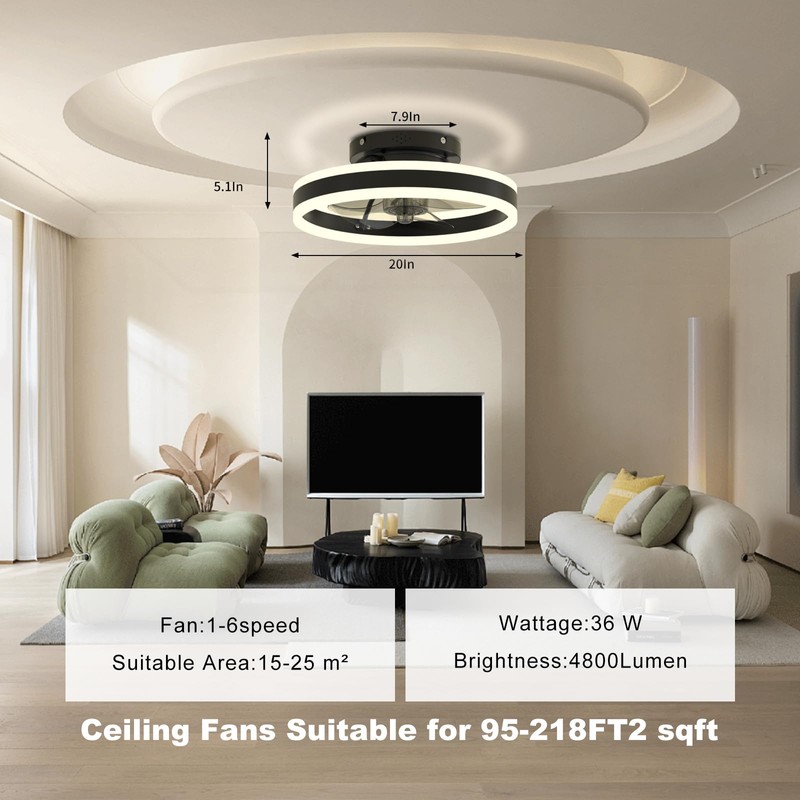 Ceiling Fans with Lights and Remote, 20'' Low Profile Ceiling Fans, 3000-6500K Dimmable Modern Flush Mount Fan Light with 3CCT and 6 Wind Speeds Fandelier Ceiling Fan for Bedroom, Living Room, Black