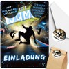 celebr8te 12 x Invitation Cards in Blue Jump Trampoline Design – For Children's Birthday Parties of Boys in Jumphouse Trampoline Park + 12 Envelopes + 24 Stickers + 12 Bags