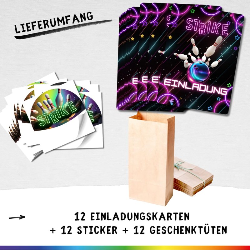 - You will receive: 12 x bowling invitation cards, high-quality printed in postcard format DIN A6 (148 x 105 mm). Made in Germany – climate-neutral printed.